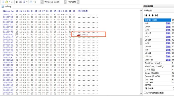 第三步:使用winhex等软件打开sn.img,你会看到AAAAAAA这样的类似序列号东西,使用