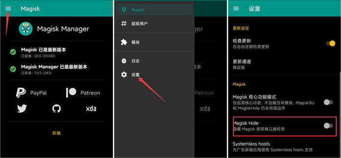 分版本打开并没有找到Magisk hide,也非常简单;点击面具的“设置” 按钮,点击设置