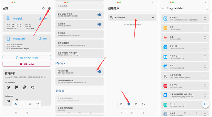 点击右上角的设置图标,找到Magisk hide按钮打开,然后重启手机。重启手机后打开面具