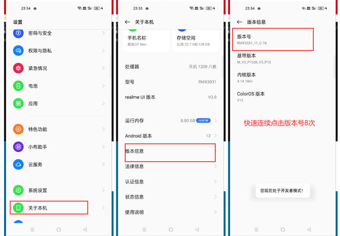 手机的一堆配置信息,找到版本信息按钮再次进入,疯狂快速的点击版本号8-10次,手
