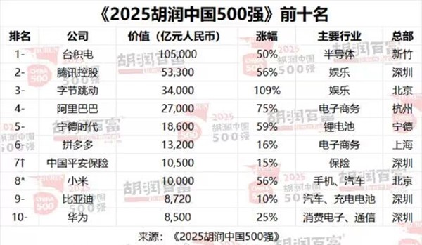 胡润研究院发布2月5日发布《2025胡润中国500强》,台积电价值增长3.5万亿元,以10.5万亿元再度蝉联中国价值最高的民营企业。腾讯价值增长1.9万亿元,以5.3万亿元稳居第二。字节跳动价值增长1.8万亿元,以3.4万亿元保持第三。小米新进前十,价值增长3570亿元,以1万亿元位列第八。