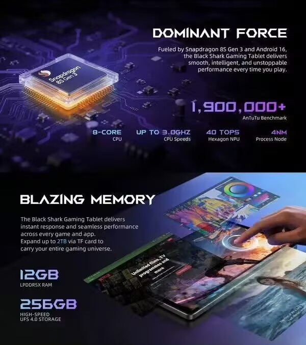 黑鲨游戏平板搭载骁龙8s Gen3移动平台,采用八核CPU,主频高达3.0GHz,并搭载40 TOPS算力的NPU,安兔兔跑分突破190万。该平板出厂预装Android 16系统,并配备12GB LPDDR5X运存与256GB UFS 4.0存储空间。此外,该平板还支持通过TF卡将存储容量扩展至最高2TB。