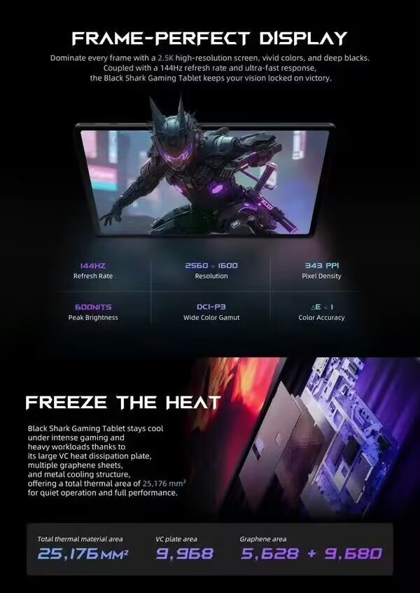 屏幕方面,黑鲨游戏平板机身尺寸为8.8英寸,正面配备一款分辨率为2.5K的显示屏,支持144Hz高刷新率与DCI-P3色域,像素密度为343PPI,峰值亮度可达600尼特。同时,该平板强大的散热系统包括大型蒸汽室、多层石墨片和金属冷却结构,确保了长时间游戏下的稳定性能。
