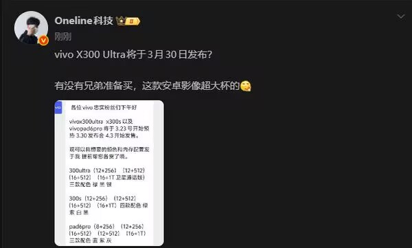 近日,数码博主@Oneline科技 放出一张聊天截图,图片内容显示vivo X300 Ultra、X300s以及Pad6 Pro将于3月23日开始预热,3月30日举办发布会,4月3日正式发售。根据流出的信息,X300 Ultra将提供12+256、12+512、16+512以及16+1T卫星通话版四个内存版本,配色涵盖绿、黑、银三款选择。