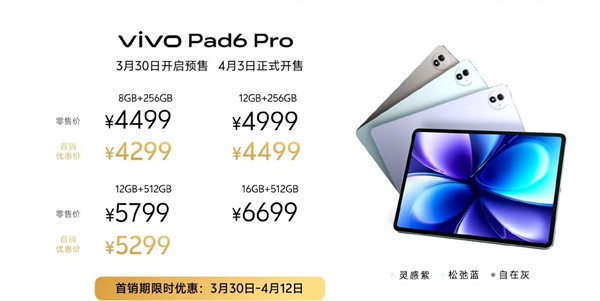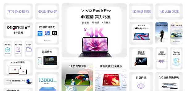 - 其他:厚6.18mm,重663g,松弛蓝、自在灰、灵感紫 3 款配色,8扬全景声学系统,支持Wi-Fi7、蓝牙5.4,USB3.2 Gen1,搭载OriginOS 6 HD系统(8GB版本不支持原子工作台)。