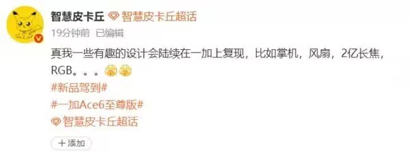 博主“智慧皮卡丘”在社交媒体上透露,真我部分特色设计将会在一加产品上陆续复现,涉及机型可能包含一加Ace 6至尊版,具体设计方向涵盖掌机、风扇、2亿长焦、RGB等元素。