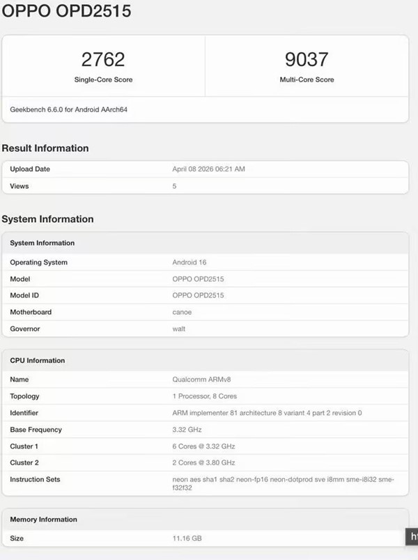 科技媒体Notebook Check发布博文,报道称型号为OPD2515的OPPO设备昨日(4月8日)现身GeekBench跑分库,6.6.0版本单核成绩为2762分,多核成绩为9037分,基于此前GSMA IMEI数据库信息,该型号关联OPPO Pad Mini平板.
