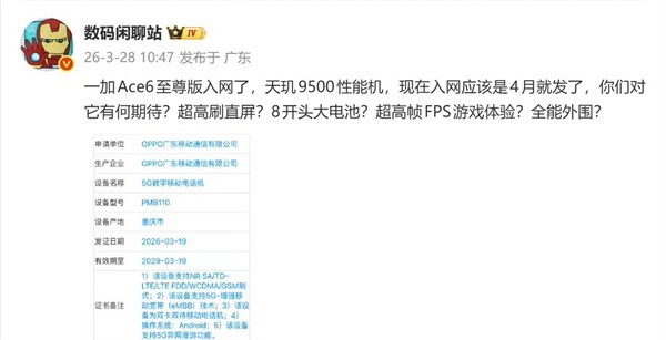 一款型号为PMB110的OPPO系新机最近取得电信设备进网许可,博主数码闲聊站 称此机为一加Ace 6至尊版。