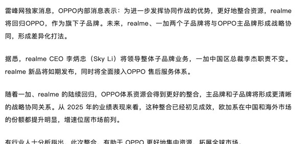 realme将回归OPPO,realme CEO李炳忠(Sky Li)将领导子品牌业务。未来,realme、一加两个子品牌将与OPPO主品牌形成战略协同,为全球用户提供更具创新力和差异化的产品,以及更便捷周到的服务。
