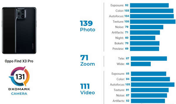 DxOMark方面公布了Find X3 Pro的影像成绩,显示其总分高达131分,位列榜单第6名。 其中拍照部分的成绩为139,变焦部分是71,视频部分为111。那么大家对于这样的结果信服吗?