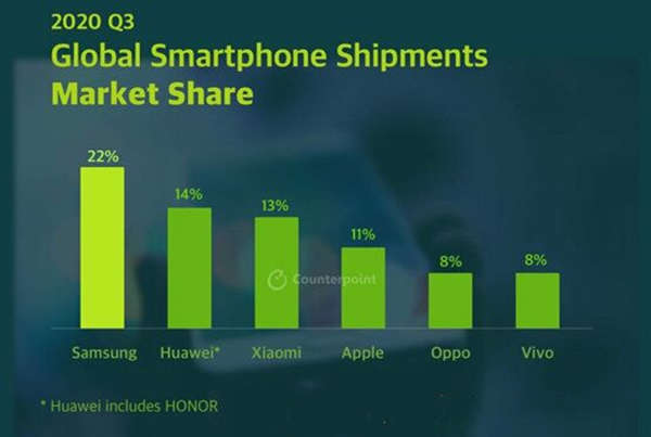 根据报告其中,三星以22%的市场份额重回冠军宝座,因为受到制裁影响,华为大幅下降,并且排在第二还是因为包括了荣耀机型,所以未来还不知道会如何。