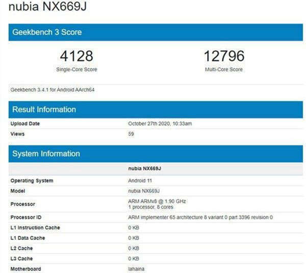 努比亚一款名为Nubia NX669J新机现身 Geekbench网站,疑似搭载骁龙875soc, 小内核主频为1.9GHz(此前搭载骁龙875的小米11为1.8GHz , 存在不确定性),单核4128分,多核12796分