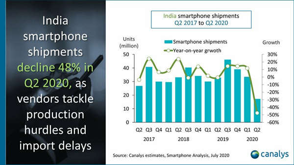 研究公司Canalys于周五晚间发布的报告称,今年第二季度印度智能手机出货量同比下降48%,这是印度智能手机市场10年来出现的最大降幅。 Top5的销量均有下跌,整个季度的销量只有1730万。就排名来看,小米以530万的销量排在第一.
