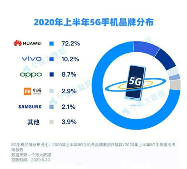 上半年5G手机品牌分布,华为占比72.2%,拿下大半的市场份额;不得不说华为上半年这个数据也太厉害了吧, 华为份额那么多,小米怎么那么少,按照网络上的“热度”来说有点出乎意料。