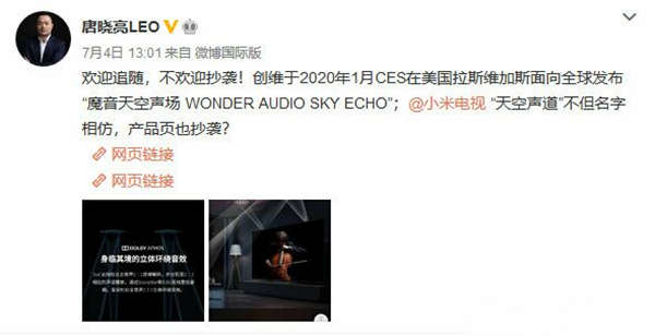 创维集团首席品牌官唐晓亮:“欢迎追随,不欢迎抄袭!创维于2020年1月CES在美国拉斯维加斯面向全球发布‘魔音天空声场 WONDER AUDIO SKY ECHO’;小米电视 ‘天空声道’不但名字相仿,产品页也抄袭?