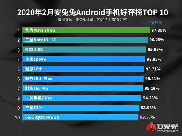 体前十的榜单大家可以根据我们的图片中看出,而从榜单中我们不难看出,在2月安卓手机好评榜中,除去前三名之外,魅族16th/16th Plus、魅族16s Pro三款手机上榜,是上榜机型最多的品牌