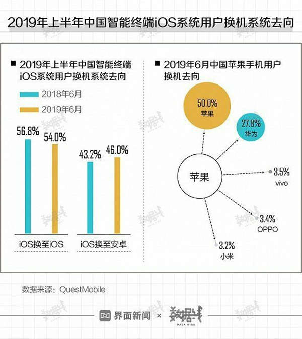 在中国,数据分析公司Quest Mobile的监测数据也显示,苹果用户的忠诚度在今年有所下降。2019年上半年,约46%的iOS用户在换机时选择投入安卓阵营