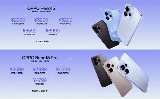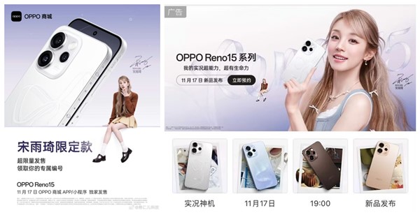 2025年11月17日19:00,OPPO Reno15系列正式发布,包含Reno15和Reno15 Pro两款机型,以“实况拍摄”为核心卖点。