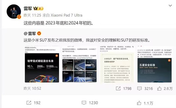 11月16日,小米创始人雷军连发多条微博辟谣小米汽车“重颜值轻安全”争议,疑似是对外界质疑的直接回应。事件源于2024年采访片段被恶意曲解。