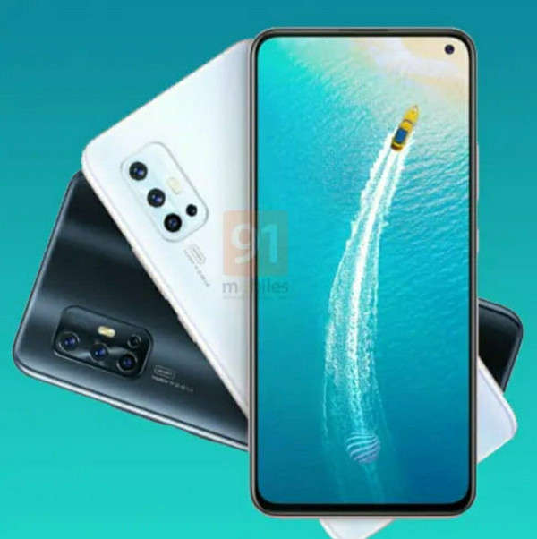 vivo V17的渲染图,vivo V17正面采用了vivo S5同款小孔径单打孔屏。而在机身背面,vivo V17采用了后置四摄方案,四颗摄像头呈“L”形排列在矩形的模组中。