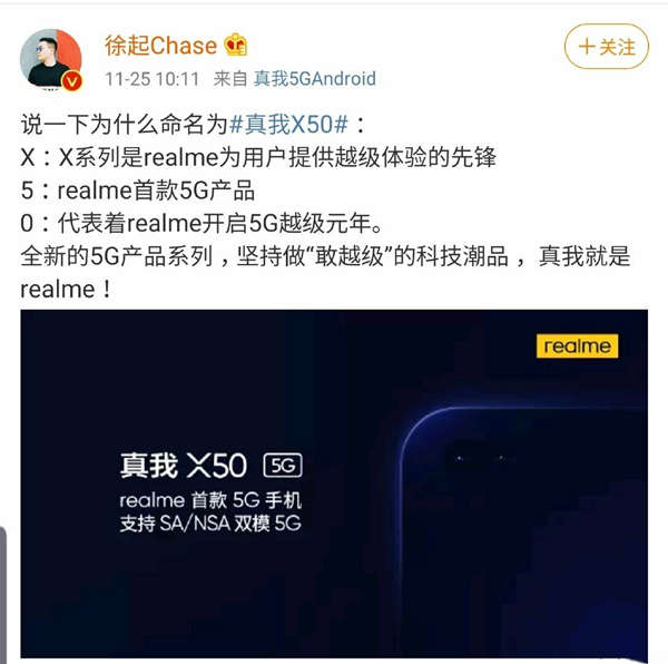 realme CMO徐起解释新机为何命名为“真我X50”,X代表为用户提供越级体验的先锋;5代表首款5G产品;0代表realme开启5G越级元年。
