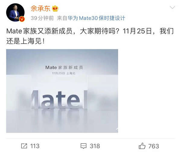 11月25日,我们还是上海见!根据余承东公布的海报,“Mate”单词之后还有3个字母被遮挡,这三个字母极有可能是“Pad”,结合来看即将登场的Mate家族新成员可能是MatePad。