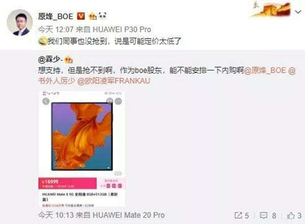 华为在官方商城VMALL独家发售折叠屏手机MateX。尽管售价高达16999元,但依然出现了“秒售罄”。