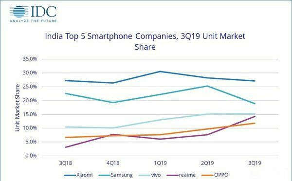 报告显示的三季度印度智能手机市场出货量为4660万部,远高于去年的4260万部。小米以27.1%的市场份额继续保持其第一的位置,和第二名三星拉开了距离