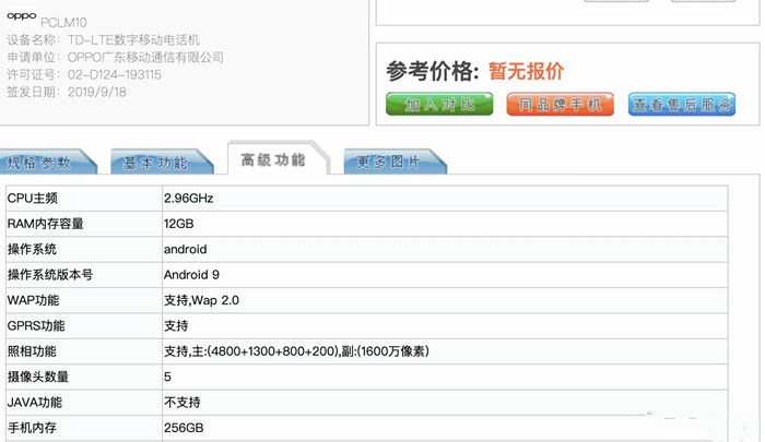工信部显示:这部OPPO Reno Ace搭载骁龙855 Plus,6.5英寸2400*1080分辨率屏幕,采用3900mAn电池,厚8.7mm,重200g。此外拥有蓝,绿,紫三个配色。