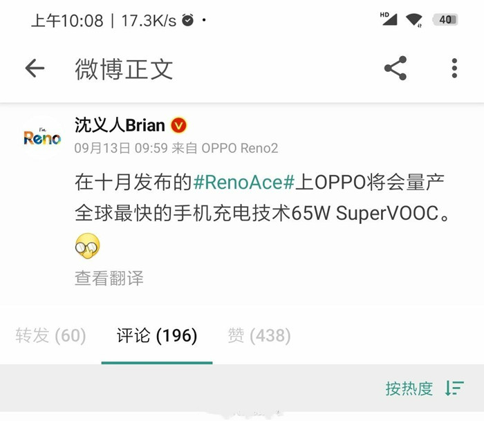 OPPO副总裁沈义人日前在微博爆料称:在十月发布的全新旗舰上OPPO将会量产65W快充技术,也透漏将会搭配于OPPO最新旗舰Ace