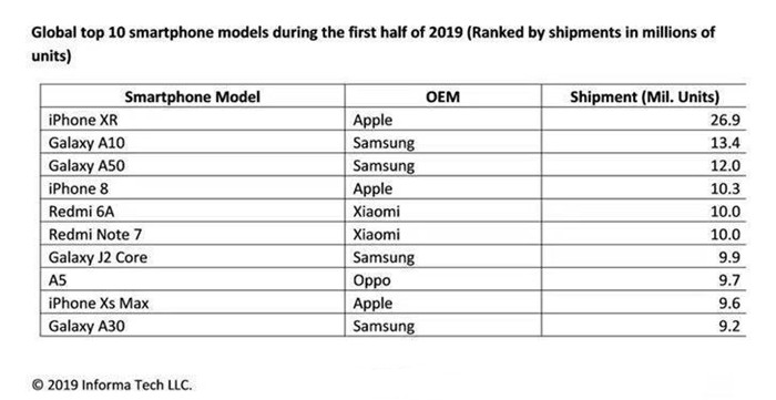 iPhone XR以2690万台夺得该榜单,可以说是遥遥领先,是第二名的二倍之多。此外三星GalaxyA10和三星GalaxyA50位列榜单第二名和第三名。