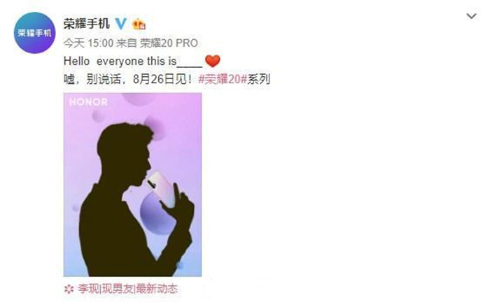 荣耀手机官方晒出了一张以人物轮廓图为主体的预热海报并配文:“嘘,别说话,8月26日见!我们知道前段时间《亲爱的热爱的》让李现红到发紫,从海报的剪影来看,荣耀20系列的新代言人就是李现了