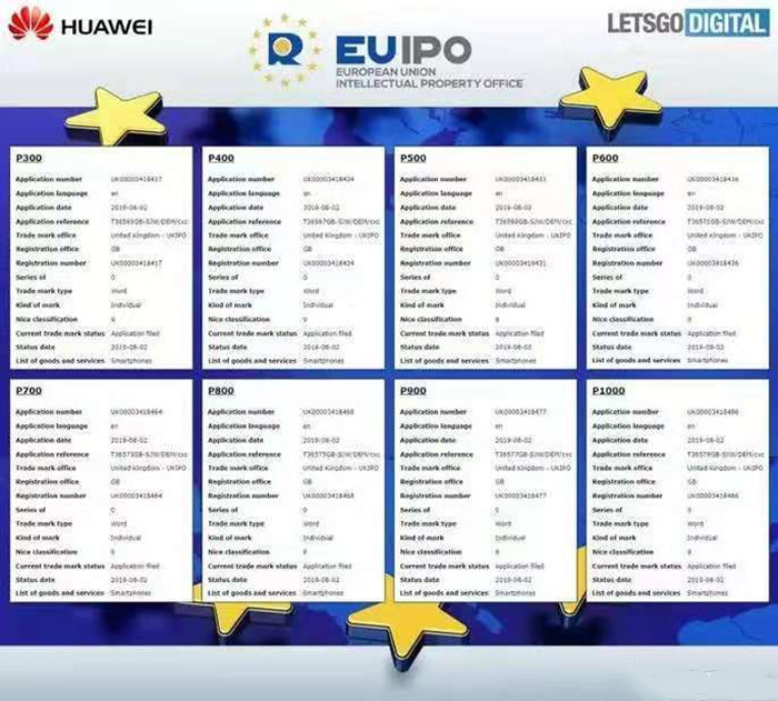 今年P系列最新的型号是P30系列,包括华为P30,P30 Pro和P30 Lite三个型号。2019年8月2日华为公司向英国IPO(知识产权局)提交了三份商标申请;名称为P300,P400和P500。
