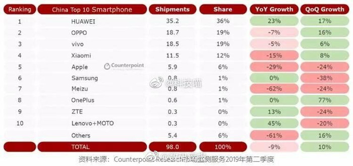 2019年第二季度的监测报告中可以看到华为,OPPO,vivo,小米,苹果位列国内手机市场的前五名,而华为手机的表现尤为突出,取得第一名占比达到36%,此外现在来说能买的品牌越来越少了,大家珍惜珍惜。
