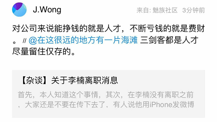魅族科技原高级副总裁李楠正式宣布离职,黄章:对公司来说能挣钱的就是人才,不断亏钱的就是费财