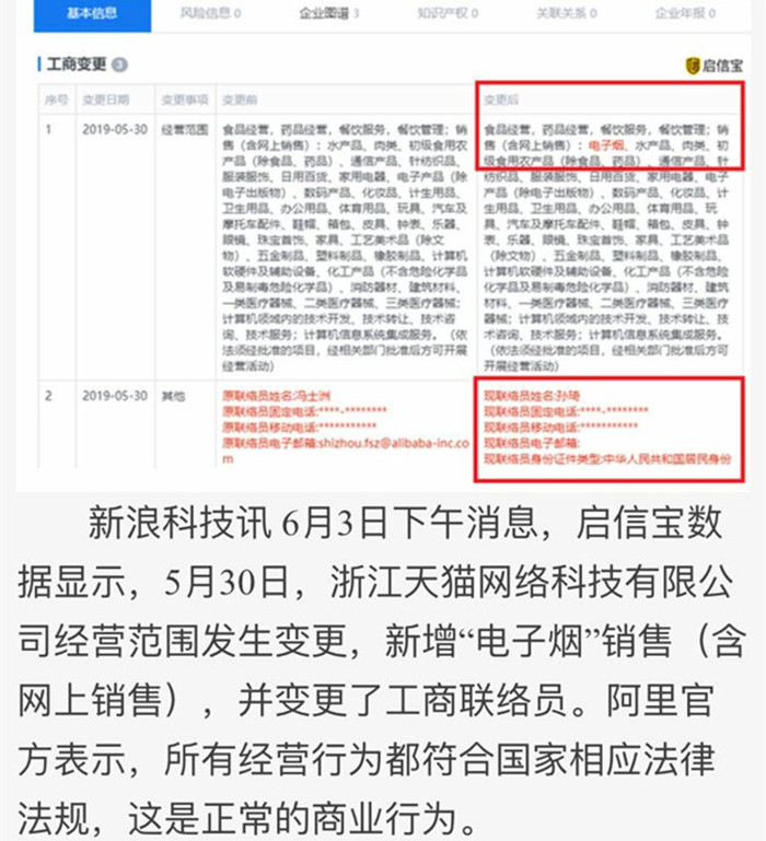 阿里的经营范围内新增“电子烟”销售。阿里对此做出了回应