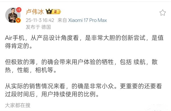 Air手机,从产品设计角度看,是非常大胆的创新尝试,是值得肯定的。但极致的薄,的确会带来用户体验的牺牲,包括 续航,散热,性能,相机等。从实际的销售情况来看,的确是非常小众。更重要的还要看过段时间后,用户持续使用的比例。